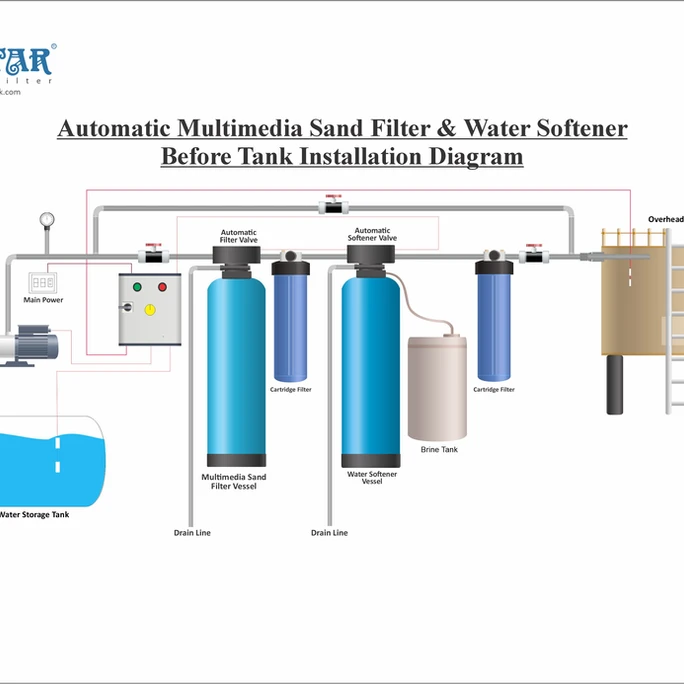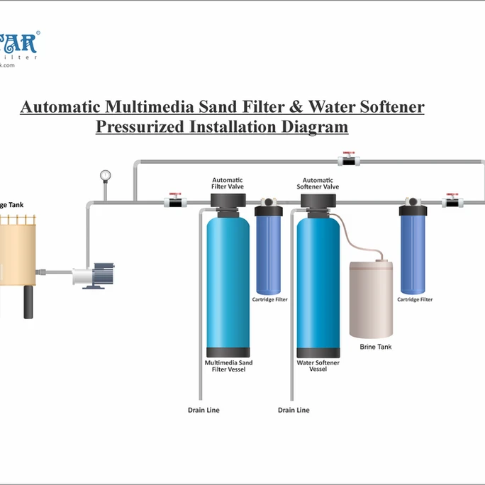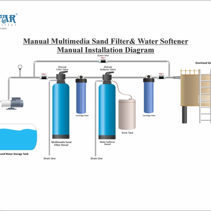 • Pre-Filtration: Incoming water first passes through the sand media filter, removing sediments and protecting the water softener from clogging and scaling.